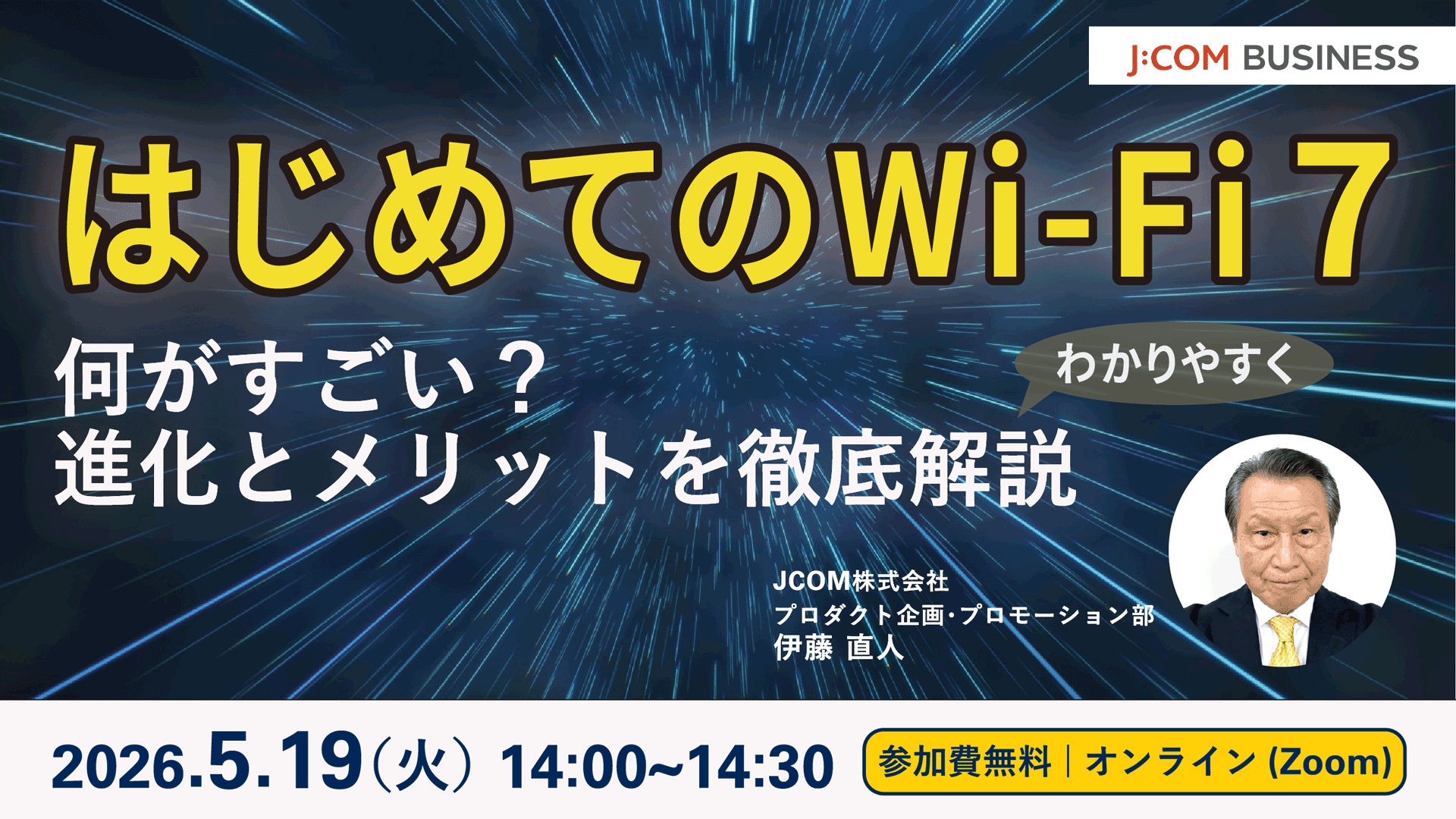 | セミナー詳細 | 【このセミナーの対象者】 【参加するメリット】 ■開催日時:2026年5月19日(木) 14:00~14:30 ■開催方法:オンライン ■主催 :J:COM BUSINESS ■参加費 :無料 ■申込締切:2026年5月18日(水) 23:59まで ■J:COM BUSINESSセミナーとは 地域企業の皆さまに寄り添いながら、DX推進や企業課題解決に役立つ最新のテクノロジーやサービスを、誰もが気軽に学べる場として提供いたします。 参加費は無料で、まずは気軽に受講をいただけるようZoomを利用したウェビナー形式で開催いたします。なお、今後コンテンツによってはより身近な形の対面形式での開催も行う予定としており、地域企業の皆さまに寄り添った支援を継続して提供してまいります。いずれの形式も多くの皆さまにご参加いただけるよう参加費は無料です。 J:COM BUSINESS 公式サイト:https://business.jcom.co.jp/ |